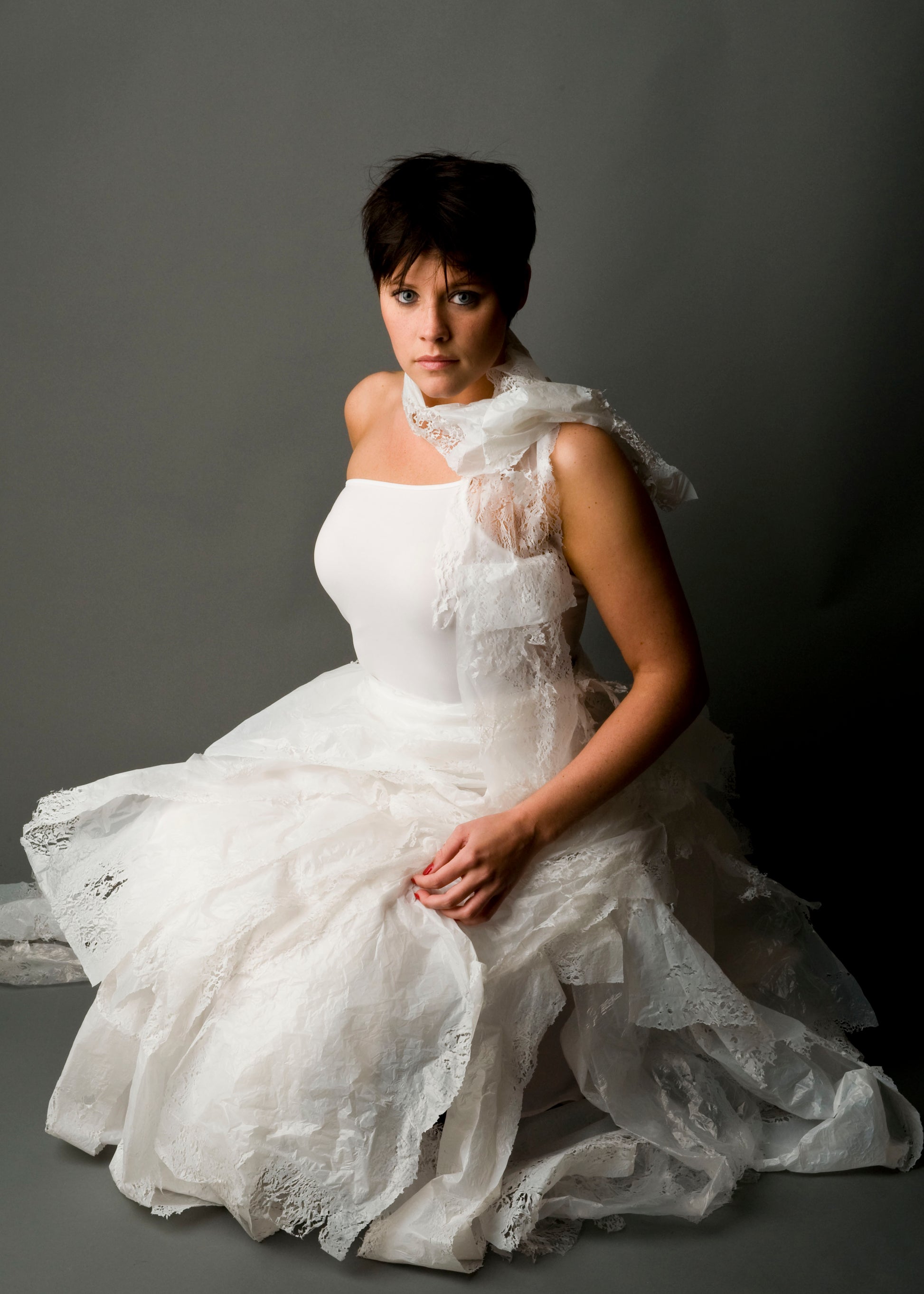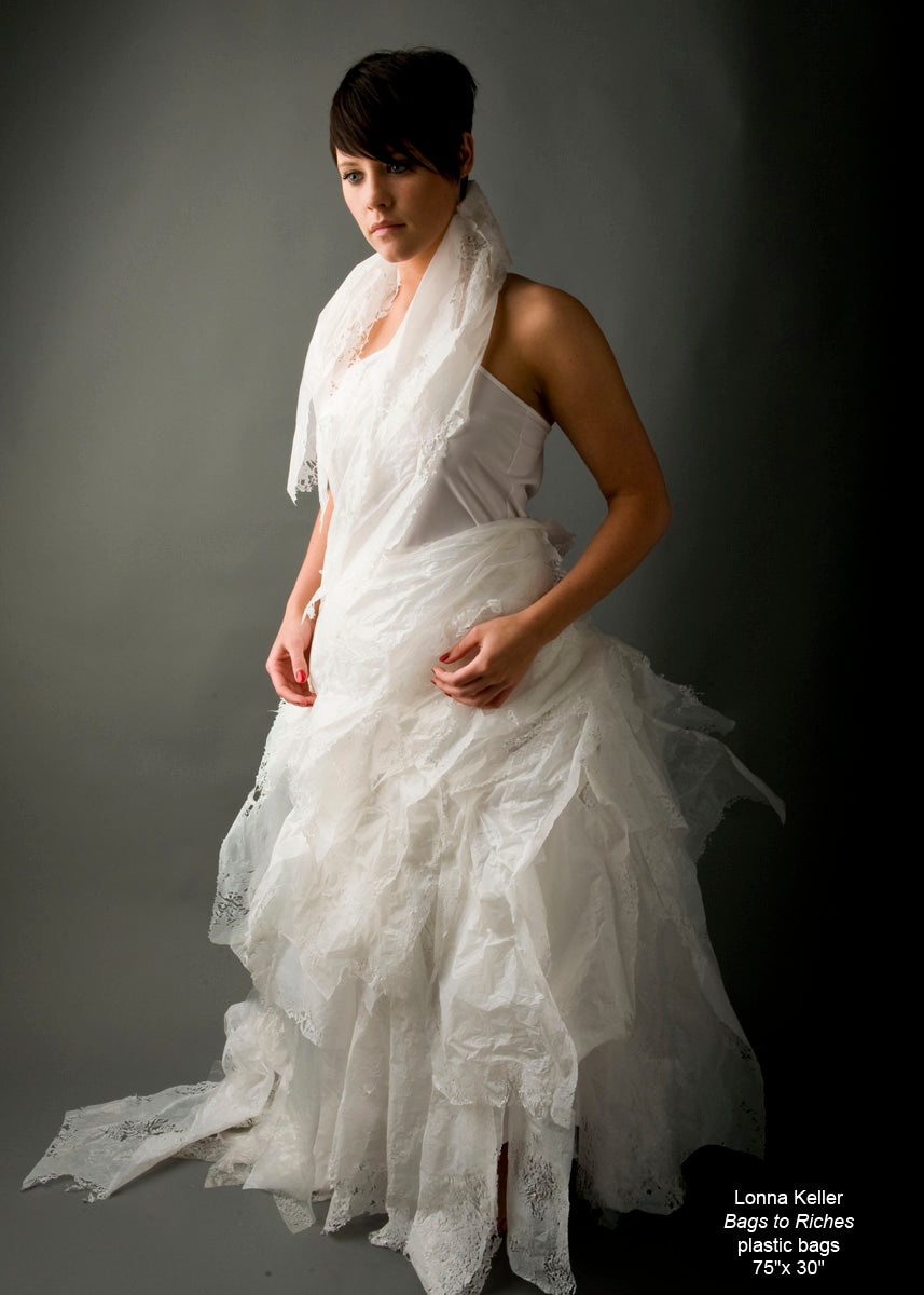 Wearable art created from plastic grocery bags.