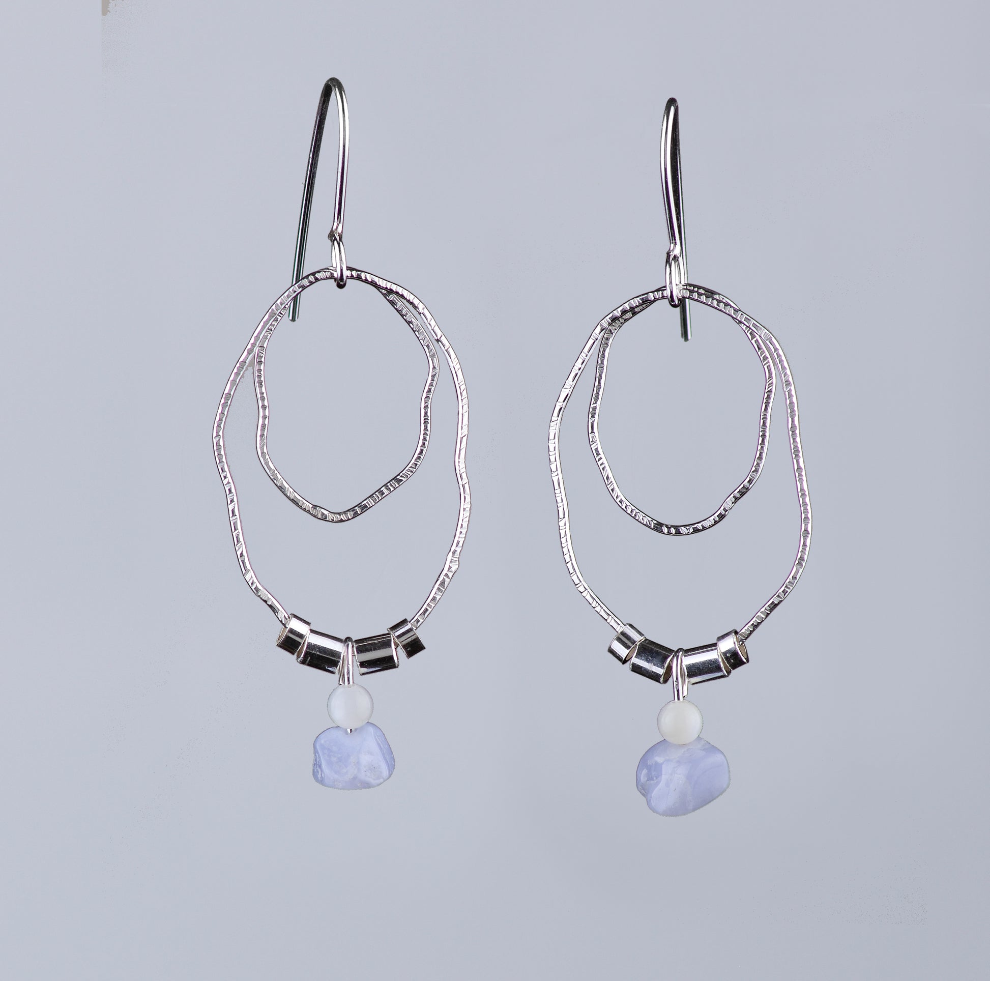 The two textured sterling silver wavy oval rings are accented with blue lace agate and white agate.