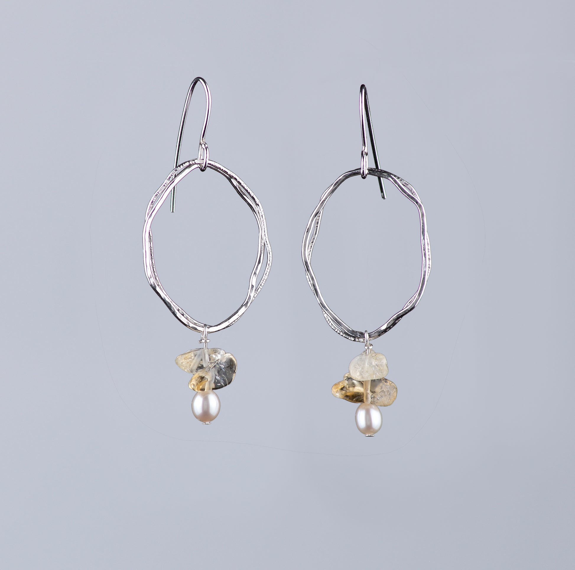 These textured sterling silver wavy oval earrings are accented with both citrine and white freshwater pearls.