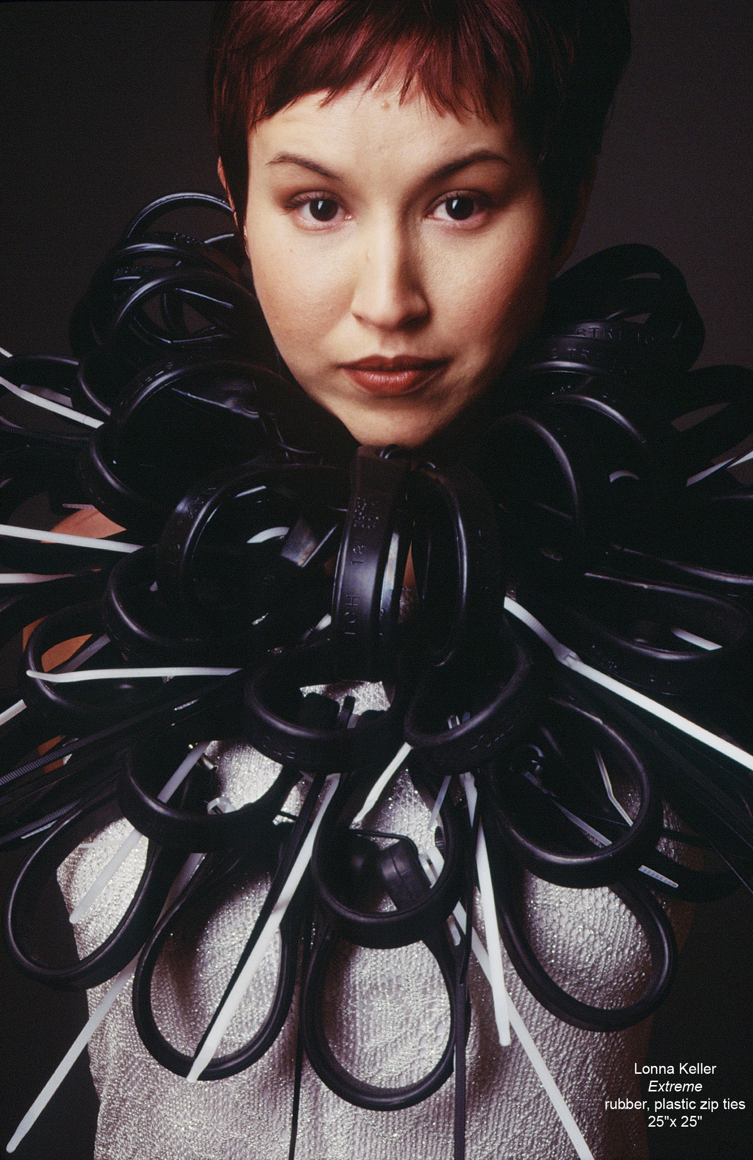 Wearable art created from rubber bungi cords, stainless steel and plastic zip ties.