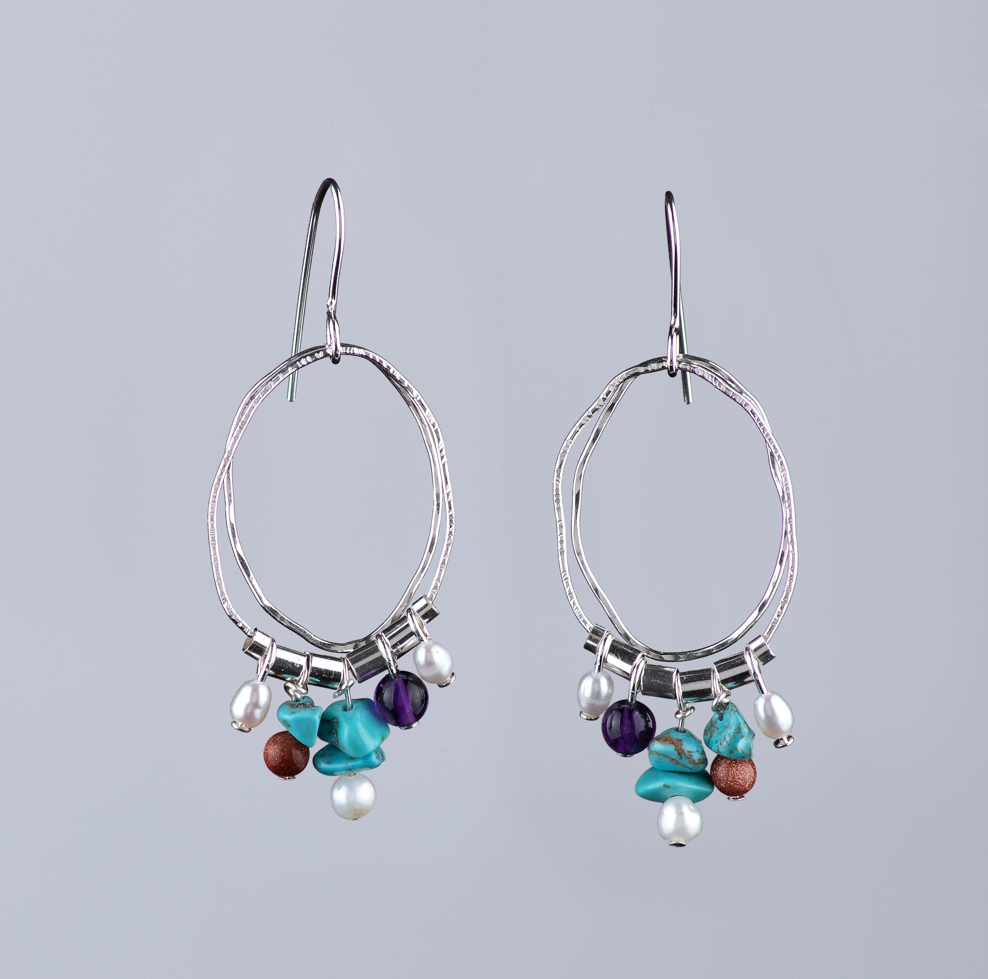 These textured sterling silver wavy oval wire earrings are accented with white freshwater pearls, turquoise, goldstone and amethyst.