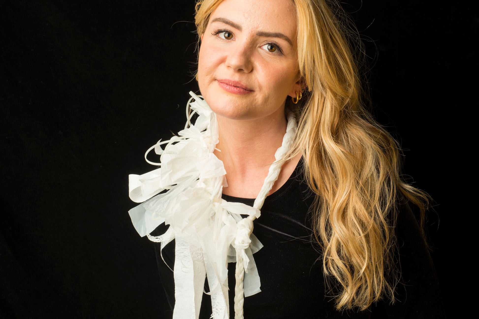 Wearable art created from recycled grocery bags and plastic zip ties.