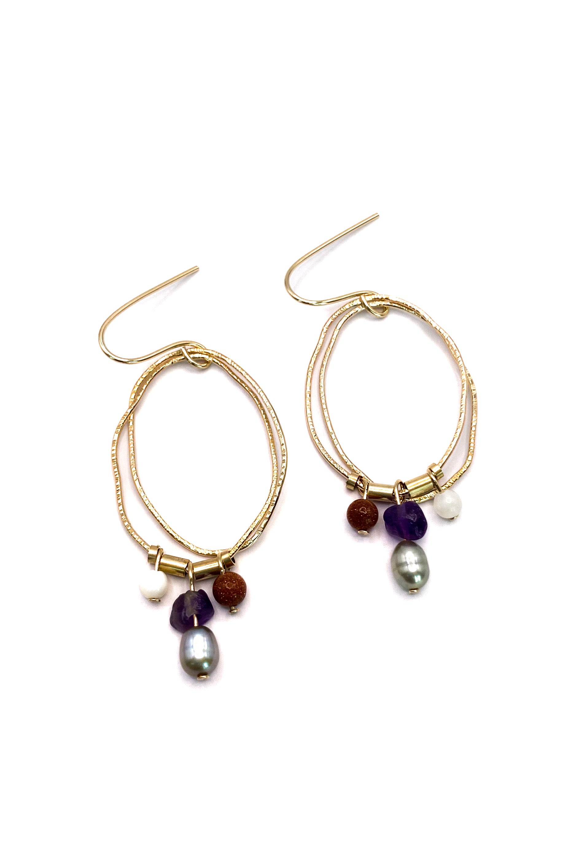 Beautifully textured 14k gold-filled wire earrings accented with goldstone, amethyst, green freshwater pearl and white agate. Earrings hang on a French wire.