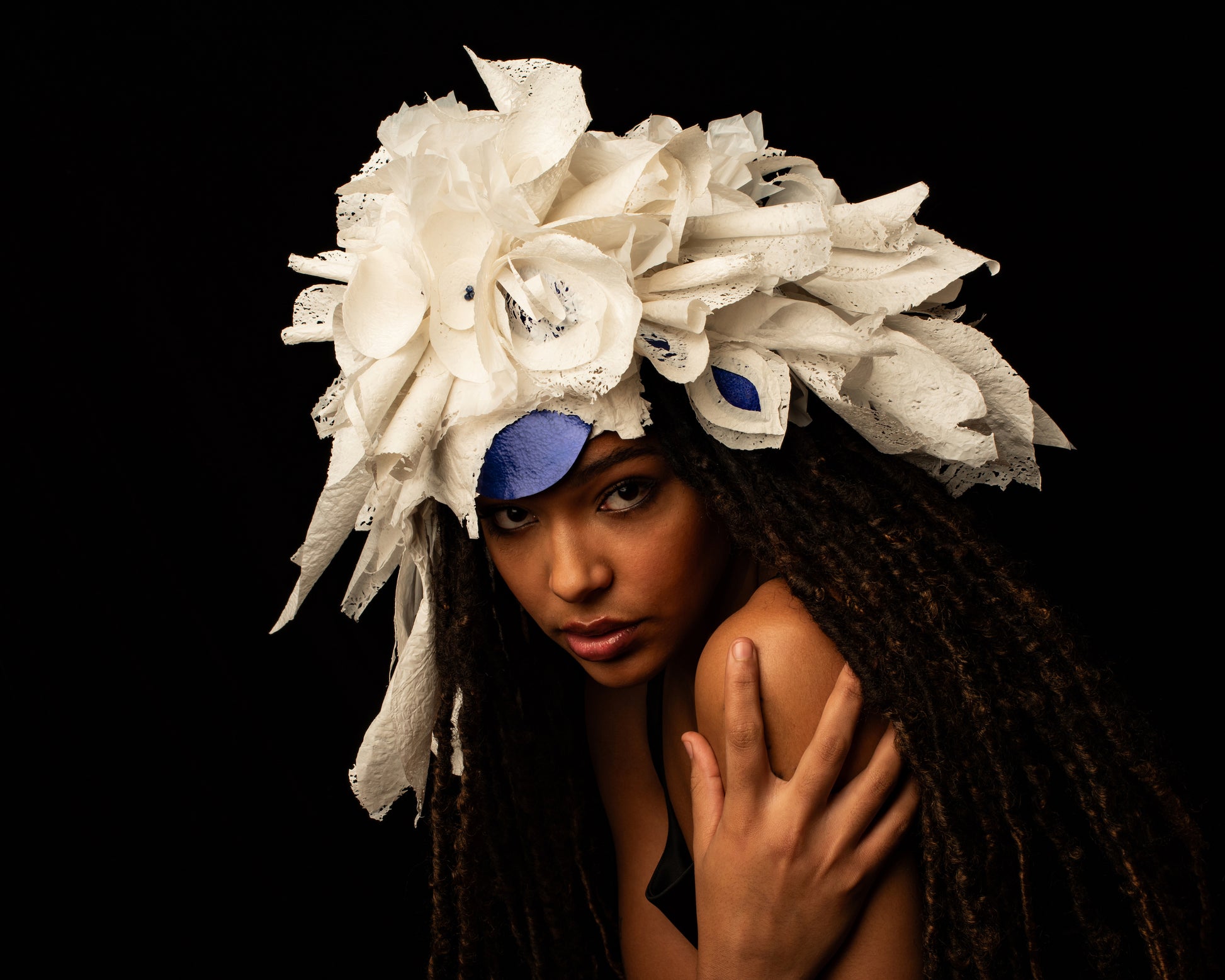 The plastic is melted and fused together to create 3-dimensional forms. Some of these forms are accented with amethyst and sodalite gemstones. The hammered and anodized aluminum is formed into "eye" like designs that also take on shapes similar to petals of a flower or feathers.